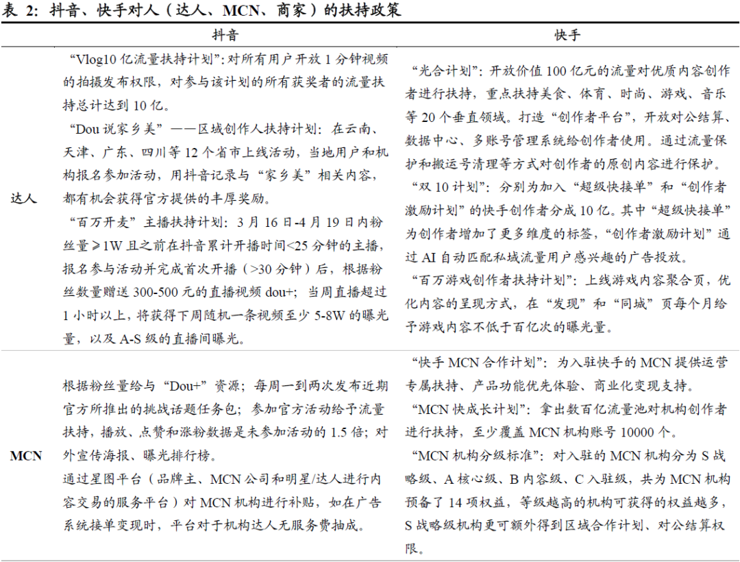 首先在人这一端,通过对达人、MCN、商家的一系列扶持政策,吸引更多的创作者、MCN机构以及线下商家入驻抖音和快手平台。