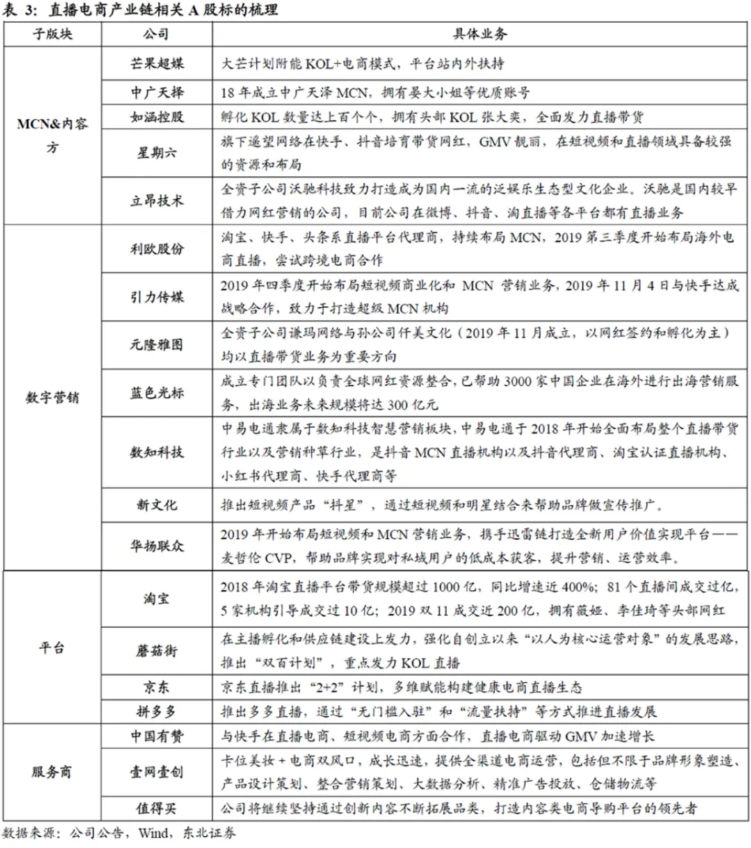 按照MCN、内容方、平台、供应链、服务方及营销公司转型等看直播电商产业链相关上市公司: